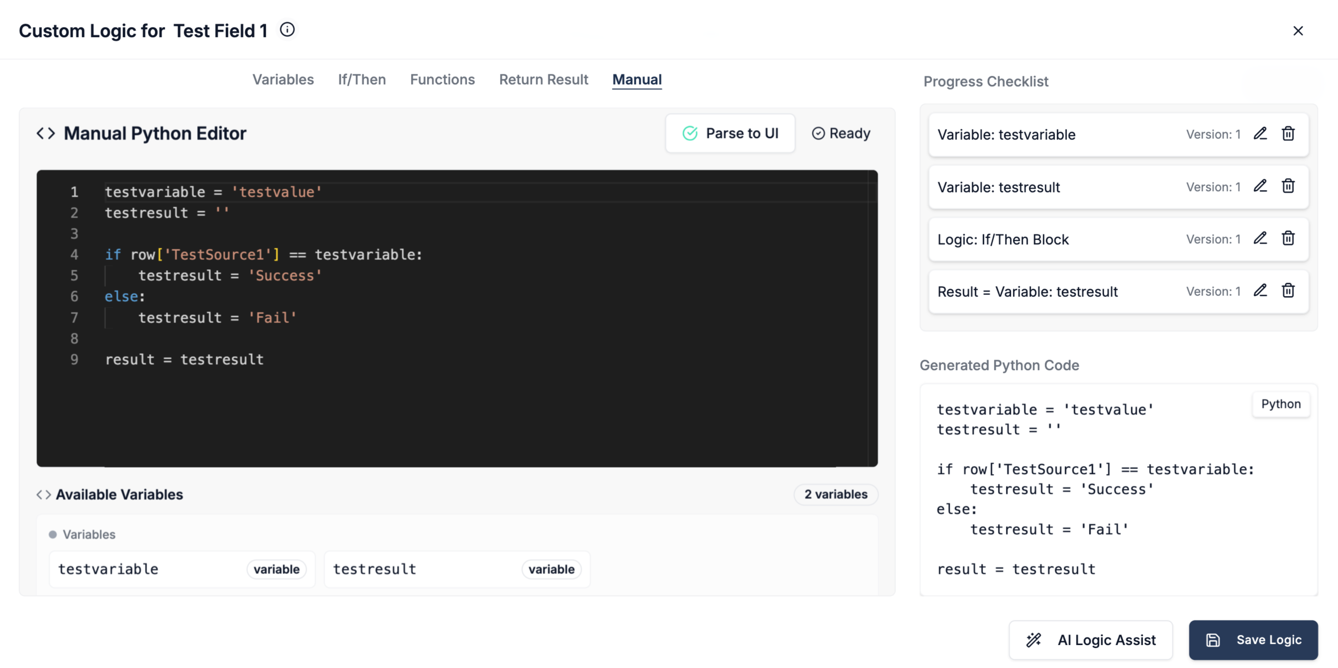 Absolutely! DataFlowMapper's Logic Builder is designed for seamless transitions between visual editing and manual Python scripting. After you've made changes in the Manual tab, you can click the 'Parse to UI' button. The system will analyze your Python code. Any logic that matches the patterns generated by our visual tools (like variable assignments, if/then blocks, or standard function calls) will be parsed back into their respective visual components in the Variables, If/Then, and Functions tabs. You can then edit these visually again! If you've written more complex Python that doesn't directly map to a visual block, it remains intact in the Manual tab and will still be executed as part of your transformation. This allows you to use the visual builder for parts of your logic and custom Python for others, all within the same field transformation.